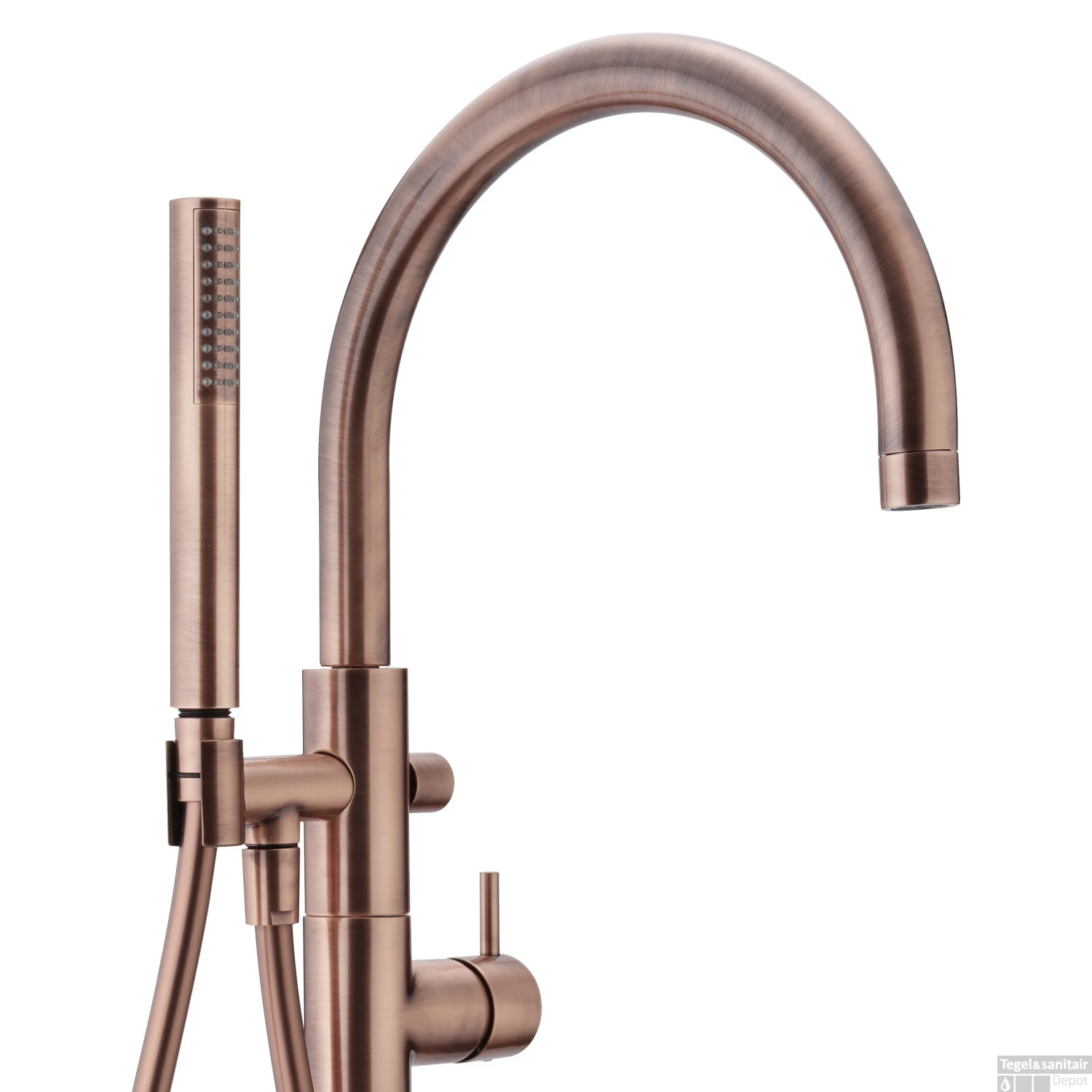 Bij de vrijstaande badkraan wordt een handdouche meegeleverd inclusief een doucheslang van 150 cm. De handdouche is netzoals de kraan gegalvaniseerd. De handdouche is recht van vorm en de kop loopt door vanuit het handvat. De sproeikop is voorzien van gaatjes, zeer elegant,strak en stijlvol.