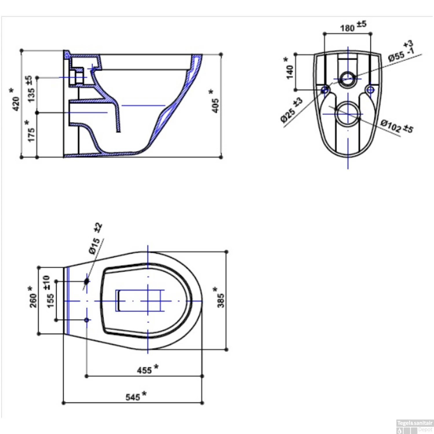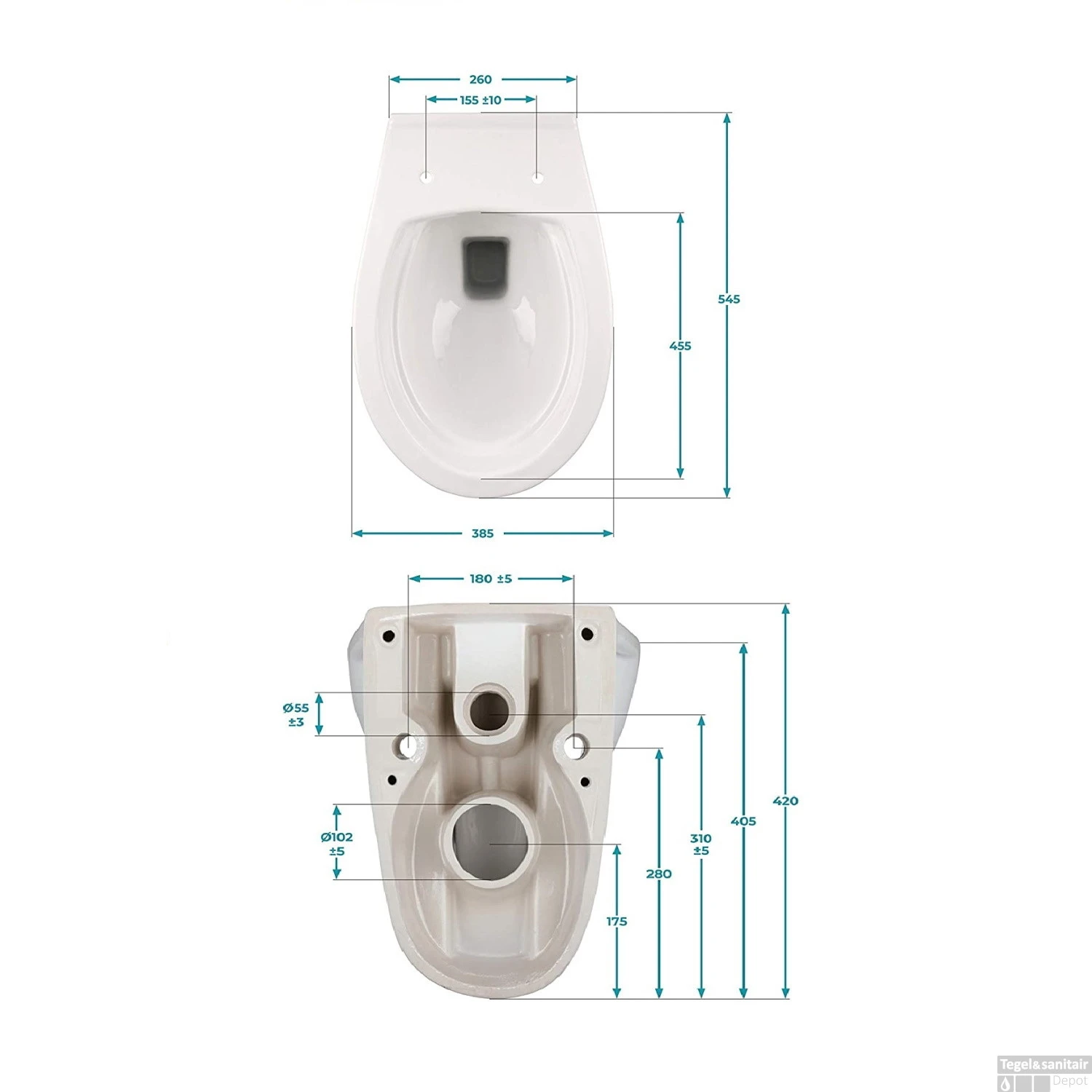 Het toilet is 40,5 cm hoog, 38,5 cm breed en 54,5 cm diep. Hij is van keramiek in de kleur wit.