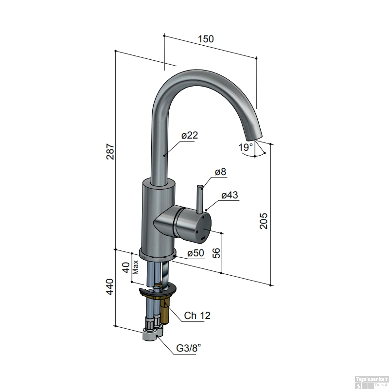 De kraan is 28.7 cm hoog, waarvan de hoogte tot aan de uitloop 20.5 cm is. De lengte van de uitloop is 15 cm. De kleur van deze kraan is RVS316. Dat is RVS dat bestemd is tegen vocht, hoge temperaturen en vuil. Het is een van de meest hygiënische materialen en is makkelijk schoon te maken. Hierdoor gaat het lang mee en heeft u dus lang plezier van deze kraan.