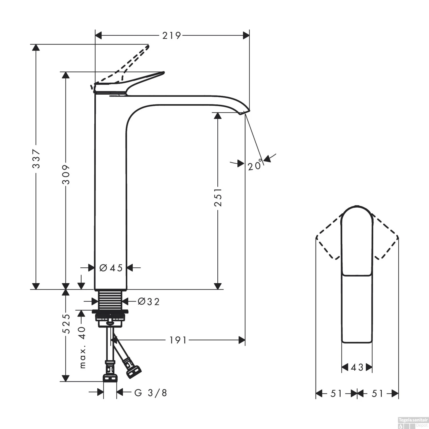 - Hoogte uitloop: 25.1 cm