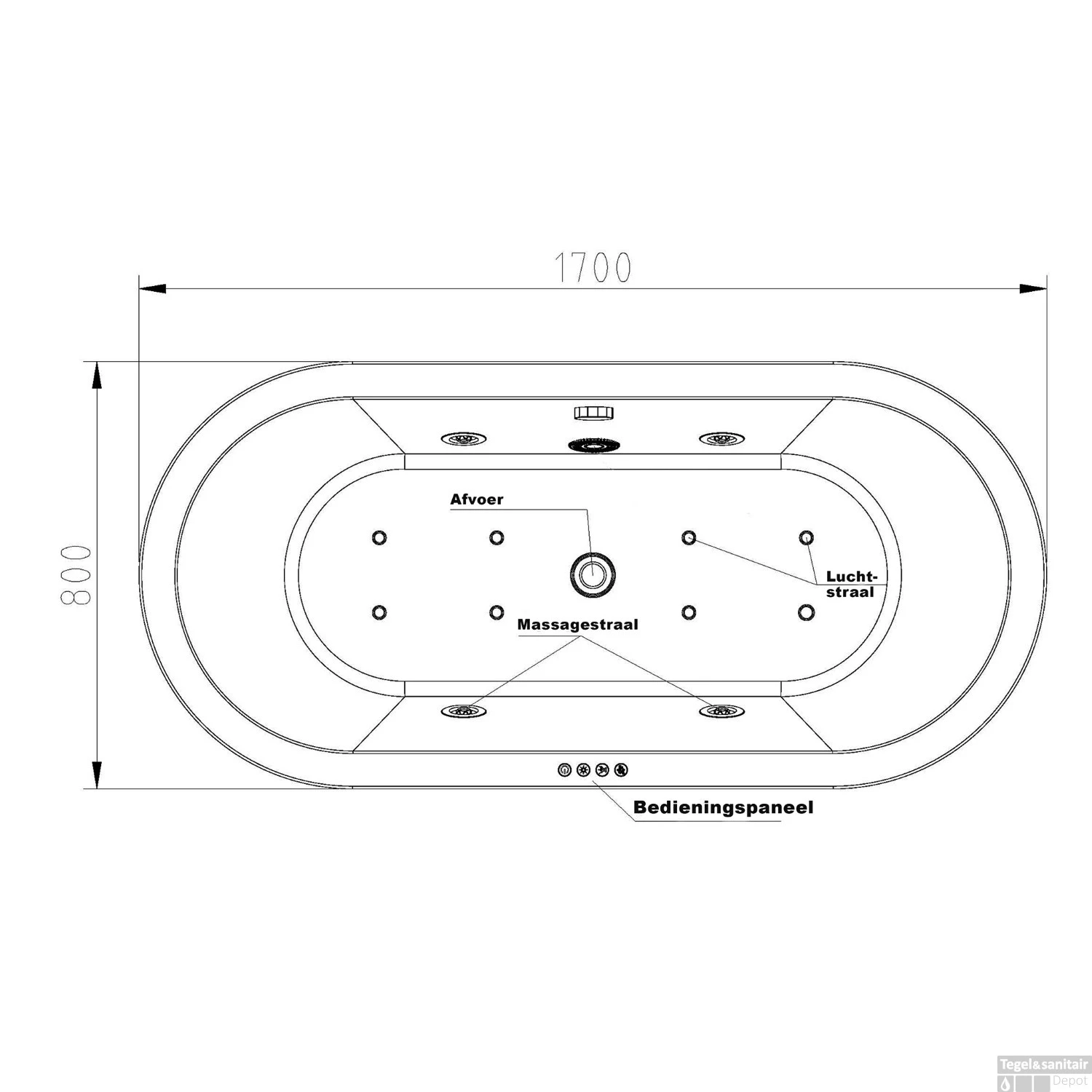 De technische tekening geeft aan waar de afvoer, massagestraal, luchtstraal en bedieningspaneel zich bevinden in het bad. Dit whirlpool uit de serie Libero is 170 cm lang en 80 cm breed.