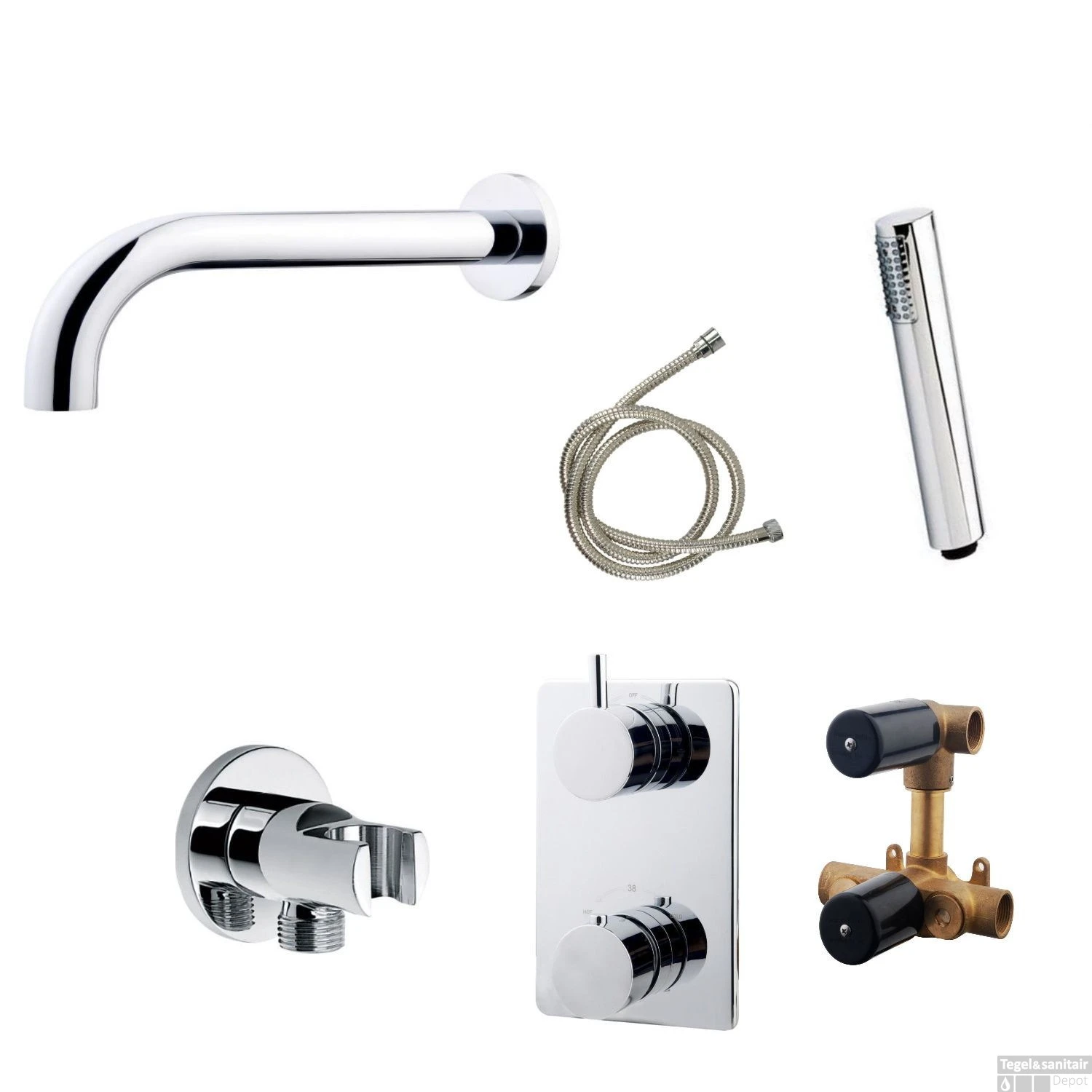 Met de aanschaf van een set bent u in 1 keer klaar. Neem deze inbouwthermostaat van het merk Wiesbaden. De badkraanset is een inbouw set wat betekent dat het grootste deel netjes is weggewerkt en alleen het nodige zichtbaar blijft. Doordat u de thermostatische kraan eenvoudig kunt bedienen door middel van 2 knoppen heeft de set een hoge gebruiksvriendelijkheid, en zorgt de inbouw set met de chromen kleur ook nog eens voor een glanzende uitstraling in de badkamer! De set bestaat niet alleen uit de inbouwkraan voor het bad, maar wordt ook geleverd inclusief handdouche. De handdouche wordt geleverd in dezelfde chromen kleur en heeft een slangaansluiting van 1/2″. Ook de doucheslang voor de handdouche wordt meegeleverd. Dat is nog niet alles want met de inbouw uitloop 20 cm (ook chroom) kunt u eenvoudig het bad laten vollopen, om daarna lekker te ontspannen.